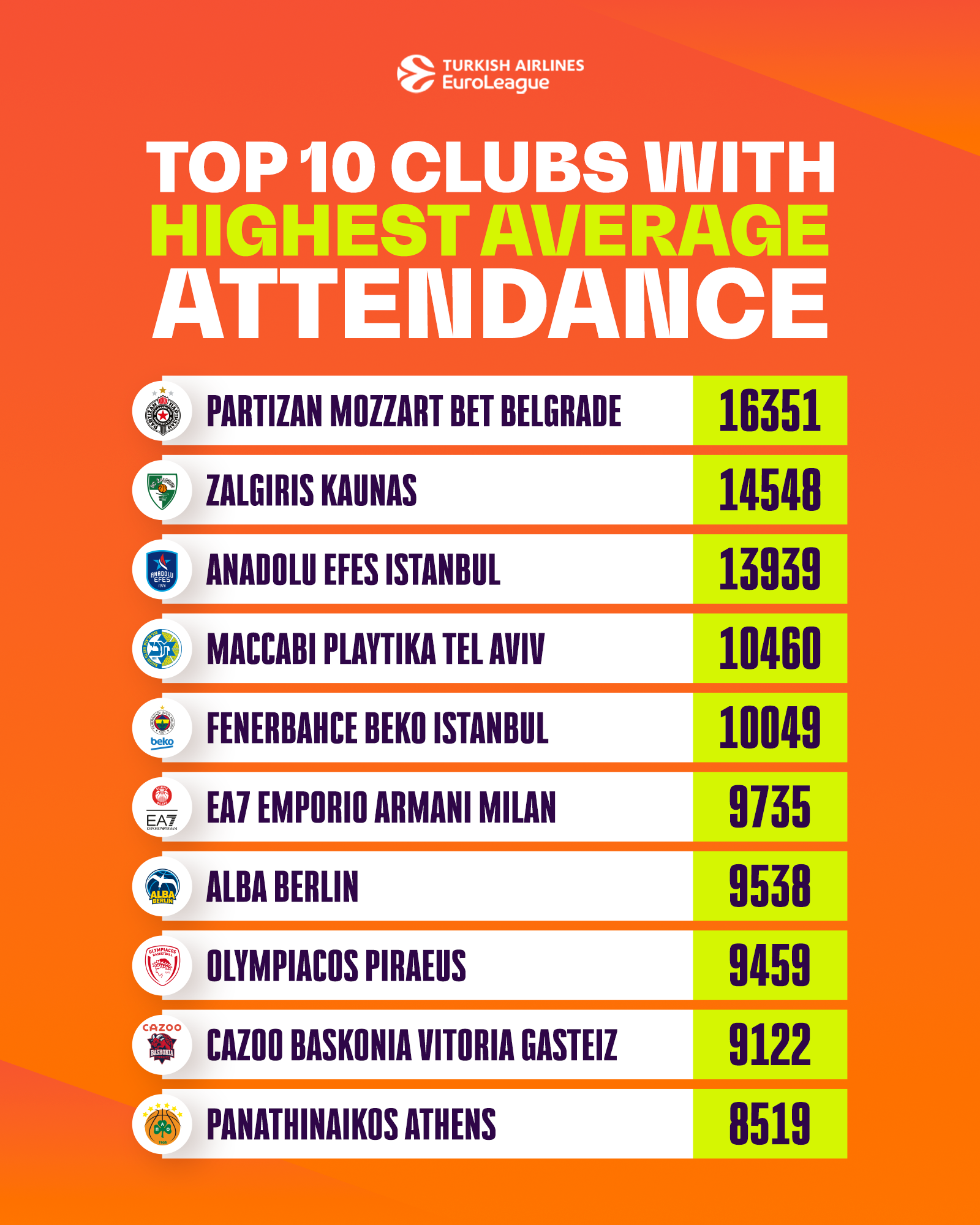 Najgledaniji tim u Evroligi jeste Partizan s prosečnim brojem navijača od 16351, a potom sledi Žalgiris sa oko 2000 ljudi manje.
