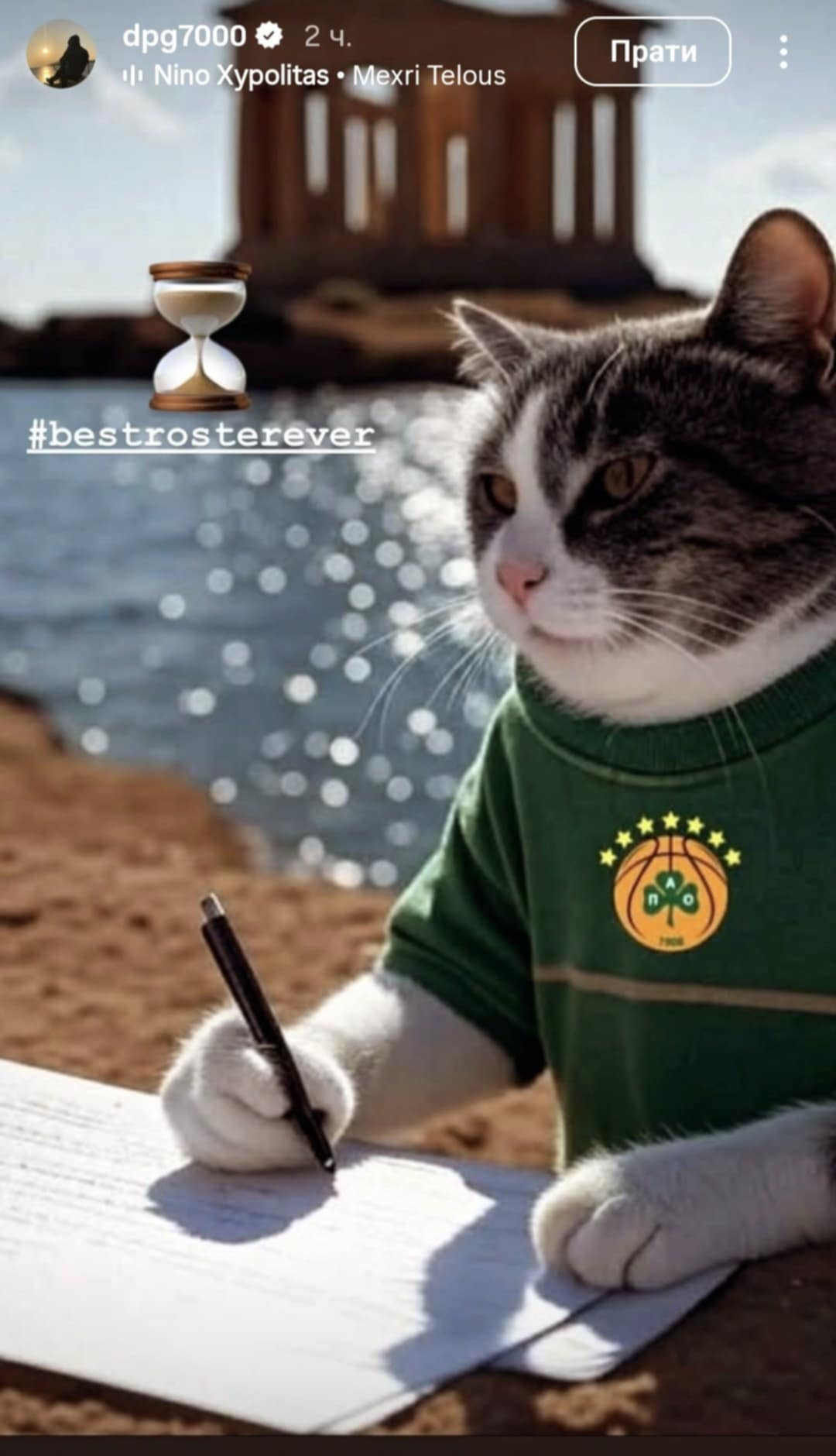 On je objavio stori na kojem je mačka u dresu Panatinaikosa sa olovkom u ruci spremna da potpiše ugovor, a u poraci je kratko i jasno pisalo: