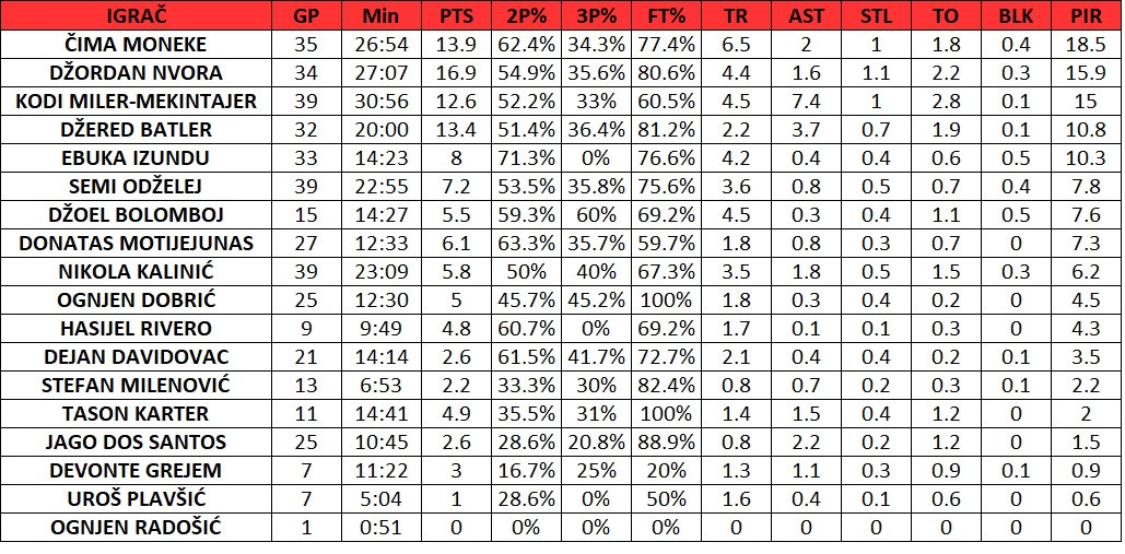 Ukupno 18 igrača je nastupilo za Crvenu zvezdu ove sezone u Evroligi, a u prilogu je njihov učinak.