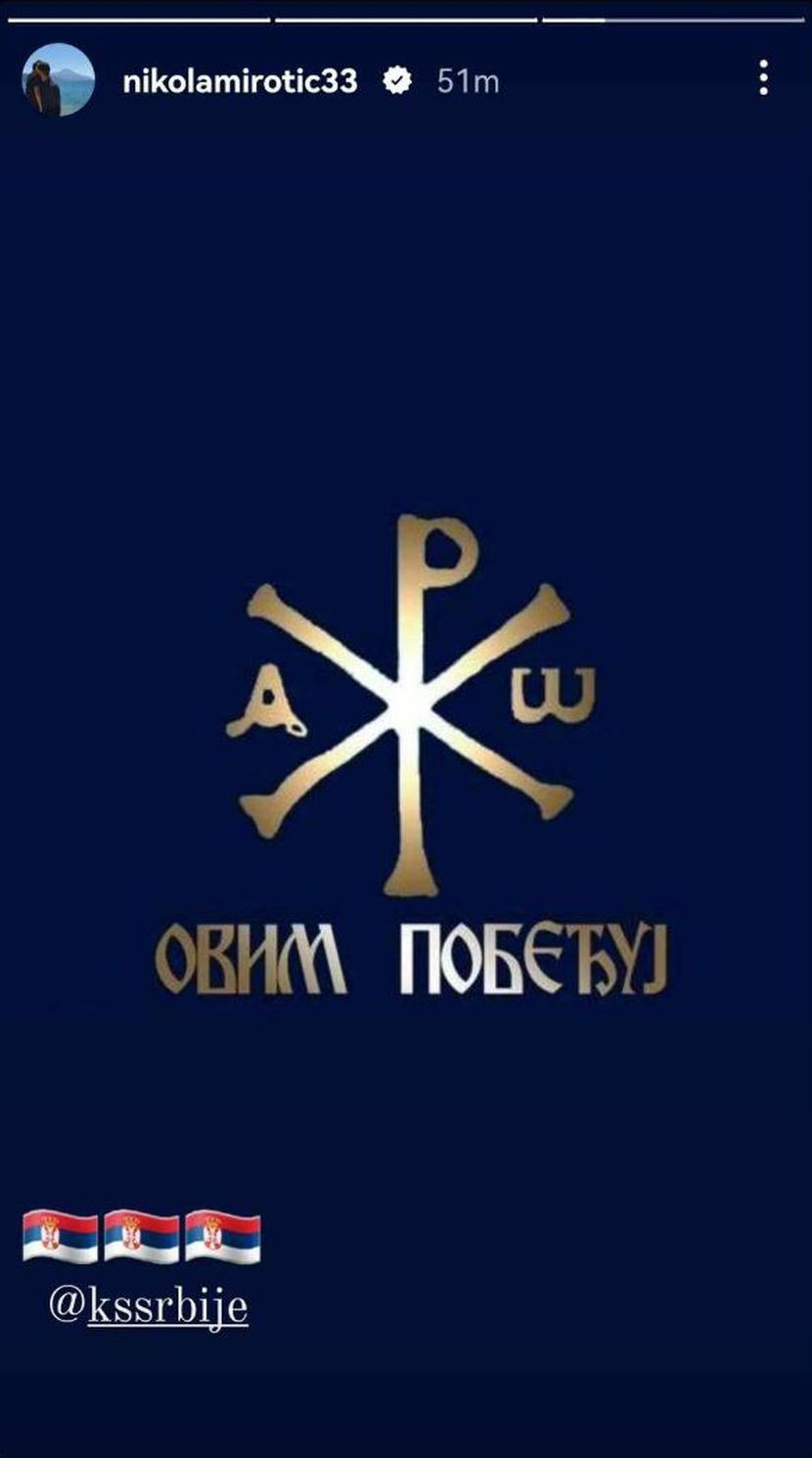"Ovim pobeđuj", napisao je Mirotić uz fotografiju na kojoj je Hristov monogram i zastave Srbije.