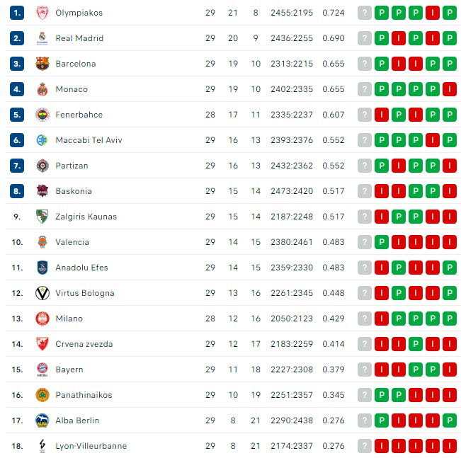 Uzmimo da je realnost da Partizan dobije dve do kraja, Panatinaikos kod kuće i jednog od tri favorita kod kuće, na kraju bi imao skor 18-16. Makabi čak može i do svih pet pobeda, ali uzmimo kao primer četiri pobede i poraz od Žalgirisa, tada bi Makabi imao 20-14 skor. Baskonija bi mogla da pobedi sve osim Olimpijakosa u gostima za skor 19-15, a Žalgiris, uz pomenutu potencijalnu pobedu protiv Makabija, bi čak mogao i do 4 pobede (realnost je da izgube u gostima od Fenerbahčea), pa bi imao skor 19-15. I Efes, sa mogućih pet pobeda do kraja bi pretekao Partizan i imao bi skor 19-15, nikada ne otpisujte evropskog šampiona. Valensiju možemo i da zanemarimo jer imaju nešto teži raspored.