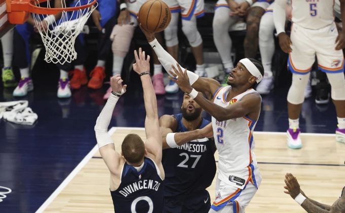 MVP je uz 40 poena, imao 10 skokova i devet asistencija, pa je Oklahoma sada blizu velikog finala. Sjajno je Kanađaninu asistirao Džajlen Vilijams koji je ubacio 34 poena i imao šest trojki. Holmgren je dodao 21 poen, sedam skokova i tri blokade u rodnom gradu. "Vukovi" su bili blizu, Edvards je promašio namerno drugo slobodno bacanje, ali nisu uspeli da šutnu.