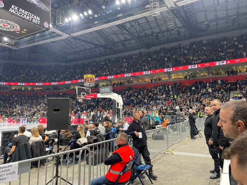 Tribine su već uveliko popunjene, a osim Trinkijerija, aplauzima i ovacijama pozdravljeni su i bivši košarkaši Partizana Vladimir Lučić i Ognjen Jaramaz.