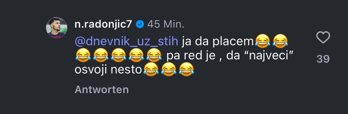 "Ja da plačem, pa red je da 'najveći' osvoji nešto“, napisao je on na jedan od komentara, uz emotikone da plače od smeha.