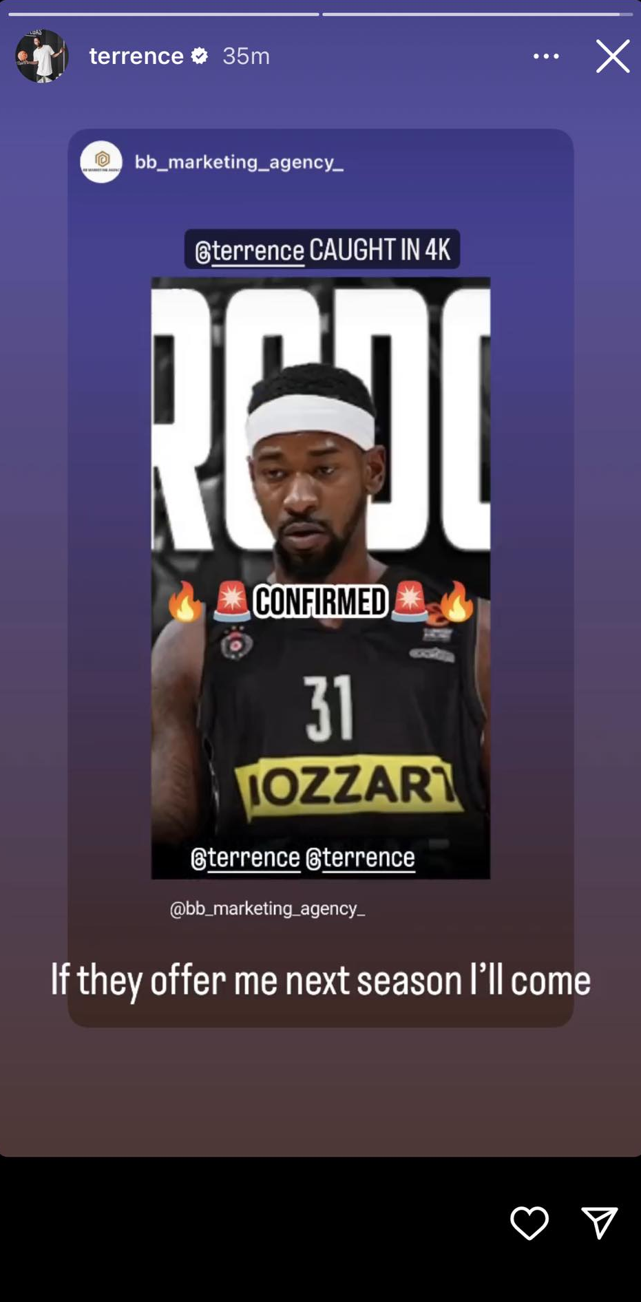 Američki košarkaš Terens Ros oglasio se na Instagramu povodom spekulacija da bi uskoro trebalo da potpiše za Partizan.