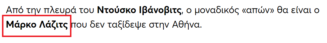 U istom tekstu se ističe da je Zvezda oslabljena za Marka Lazića koji nije doputovao u Atinu. Naravno, očigledan je lapsus grčkih kolega budući da je u pitanju Branko.