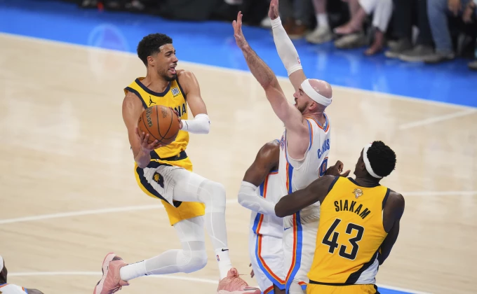 Prvo su stvari išle kako se Oklahoma nadala. Agresivnom odbranom su prisili Pejserse na čak 19 grešaka u prvom poluvremenu i imali +12 na poluvremenu. Ali, za Indijanu to nije bilo dovoljno, tačnije za Tajrisa Halibartona nijedna prednost nije nenadoknadiva. Pogodio je u poslednjoj sekundi i šokirao domaće navijače, 111:100, Indijana je veliko finale otvorila brejkom!