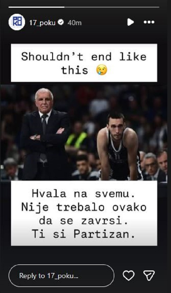 ''Hvala na svemu. Nije trebalo ovako da se završi. Ti si Partizan'', napisao je Pokuševski na Instagramu, uz tužni emotikon.