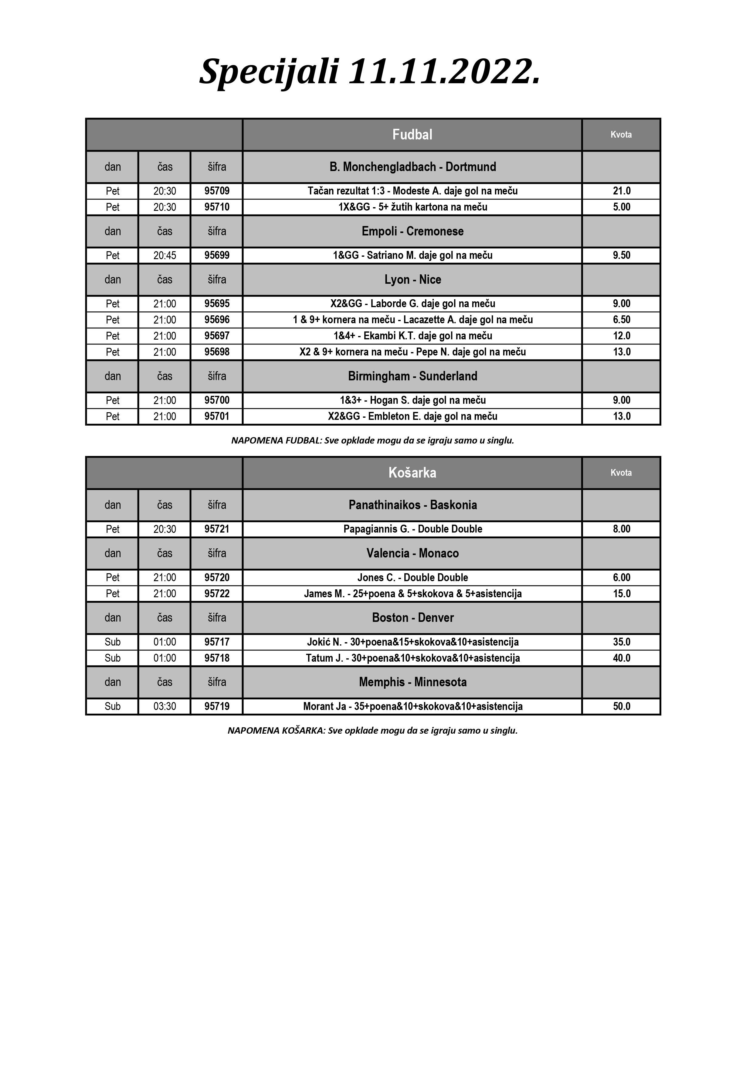 Specijali su u pitanju. Evroliga se nastavlja, nakon sinoćnjih poraza Zvezde i Partizana, na programu su večeras dva meča. Panatinaikos i Baskonija, kao i Valensija i Monako. Možete da se kladite na poene igrača, ali i specijale, kakav je recimo na fantastičnog Majka Džejmsa.