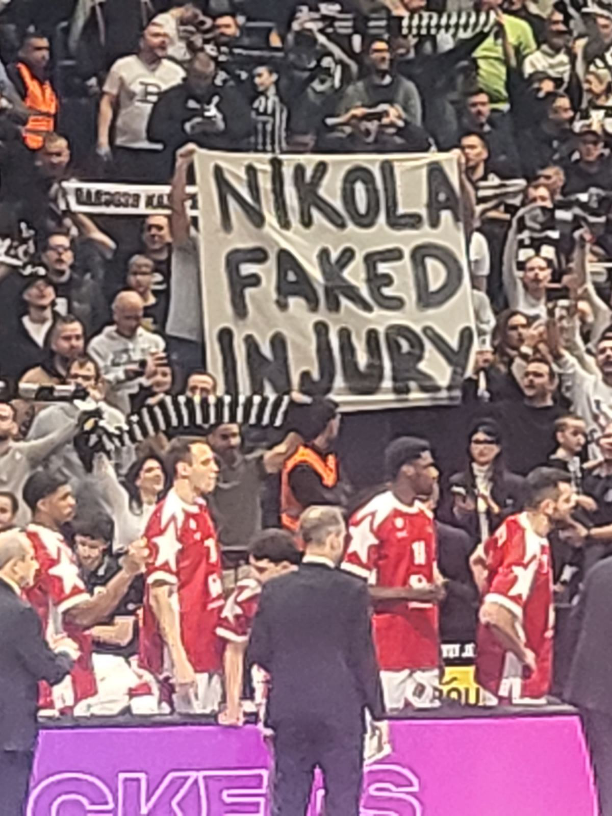 "Nikola faked injury", pisalo je na jednom od transparenata navijača "crno-belih" koji u prevodu znači "Nikola je lažirao povredu".