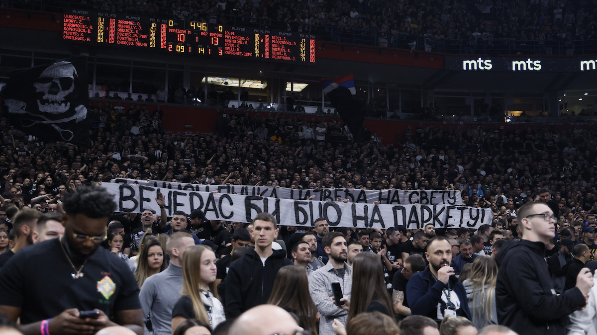 Naime, Etore Mesina ne može da računa na Nikolu Mirotića koji zbog povrede nije ni doputovao za ovaj meč, a navijači Partizana imali su posebnu poruku za njega.