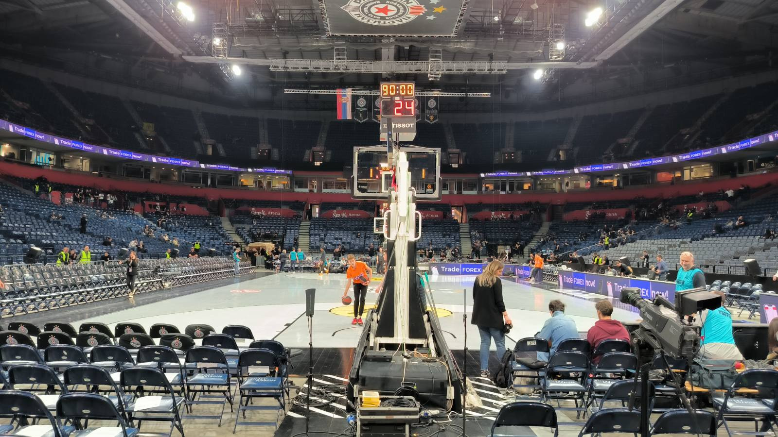 Na zagrevanju u aktuelnom momentu (18.55) nalaze se Najdžel Vilijams-Gos, Serhio Rodrigez i Entoni Rendolf kada je u pitanju Real Madrid. Naravno, dočekani su zvižducima prisutnih. S druge strane, Džejms Naneli i Tristan Vukčević zagrevaju se za Partizan.