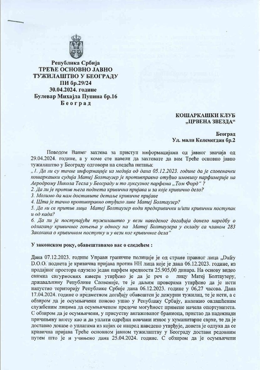 Zvezdin upit i odgovor Tužilaštva pogledajte na fotografijama ispod teksta.
