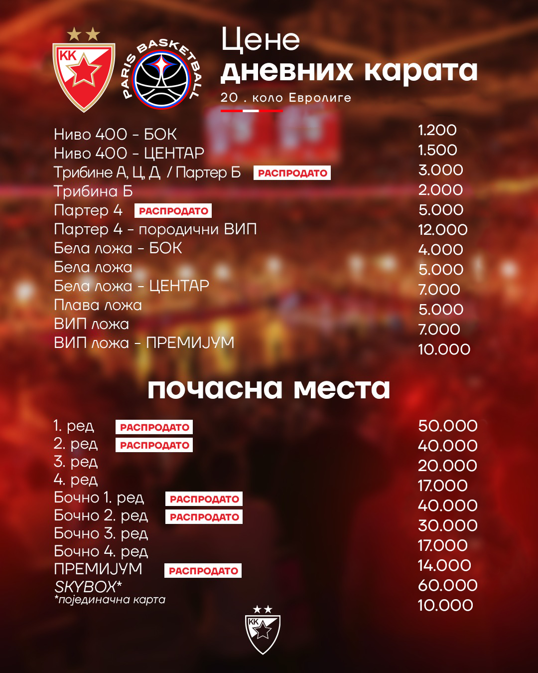 Pored toga, od danas su u prodaji i karte za mečeve AdmiralBet ABA lige u "Areni", najpre protiv Krke u nedelju 29. decembra od 18 sati, a onda i FMP-om 5. januara naredne godine od 19.30.