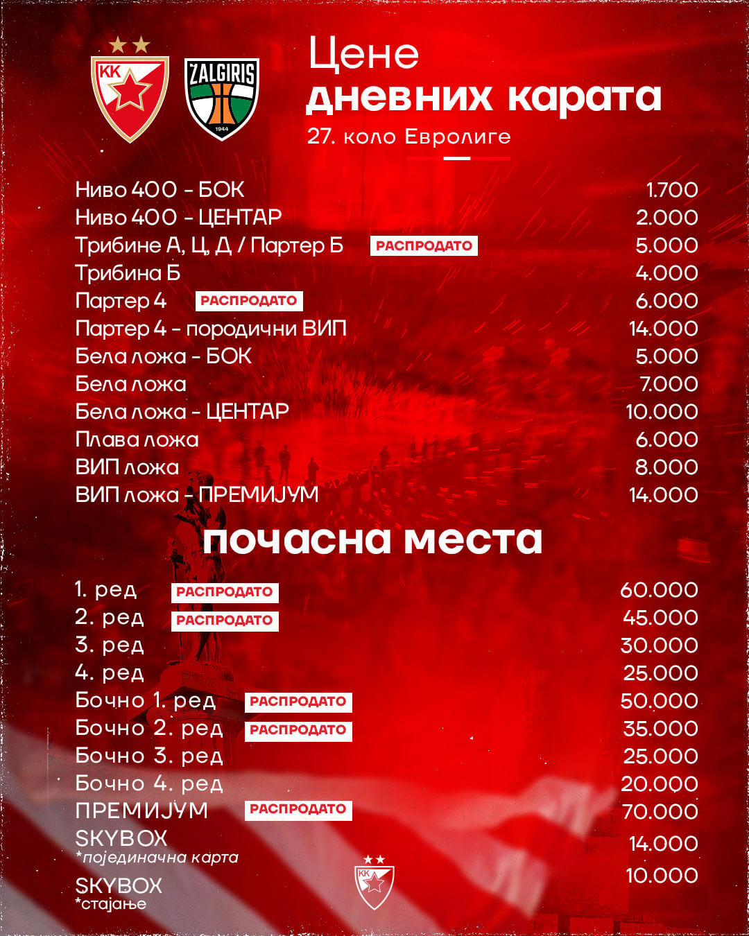 Zvezda je obavestila svoje pristalice da će se karte za utakmicu Crvena zvezda - Žalgiris prodavati od sutra u 12 sati. Najeftinije ulaznice za NIVO 400 bok koštaju 1700 dinara,a do karata se može doći i onlajn putem.
