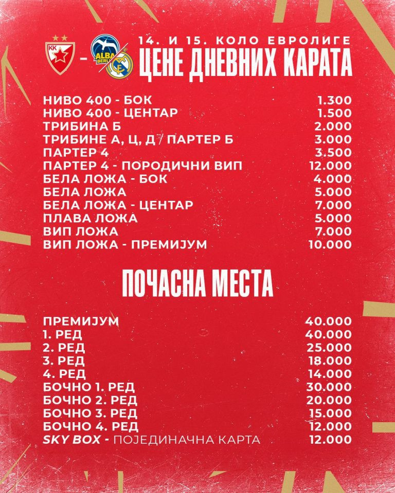 Klub sa Malog Kalemegdana u ponedeljak u 10 sati pustiće u prodaju ulaznice za utakmice protiv Albe i Reala, a najeftnije karte koštaju 1.300 dinara.