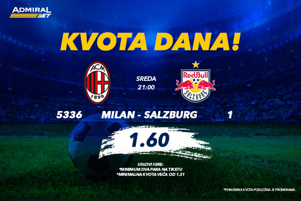Uz to, nastavlja se akcija "Kvota dana", ako odigrate najmanje jedan par sa kvotom većom od 1.30, možete da kombinujete sa najvećom kvotom u Srbiji, ali i van nje, na pobedu Milana protiv Salcburga. "Rosoneri" ne smeju da izgube ako žele top 16 fazu. Napominjemo da je kvota (trenutno 1.60) podložna promenama, ali da će u svakom trenutku biti veća nego u ostalim kladionicama.