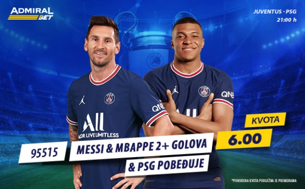 To znači Mesi i Mbape od prvog minuta, AdmiralBet na njihova dva gola ukupno i pobedu PSŽ koja bi u tom slučaju bila izvesna, nudi kvotu 6.00.