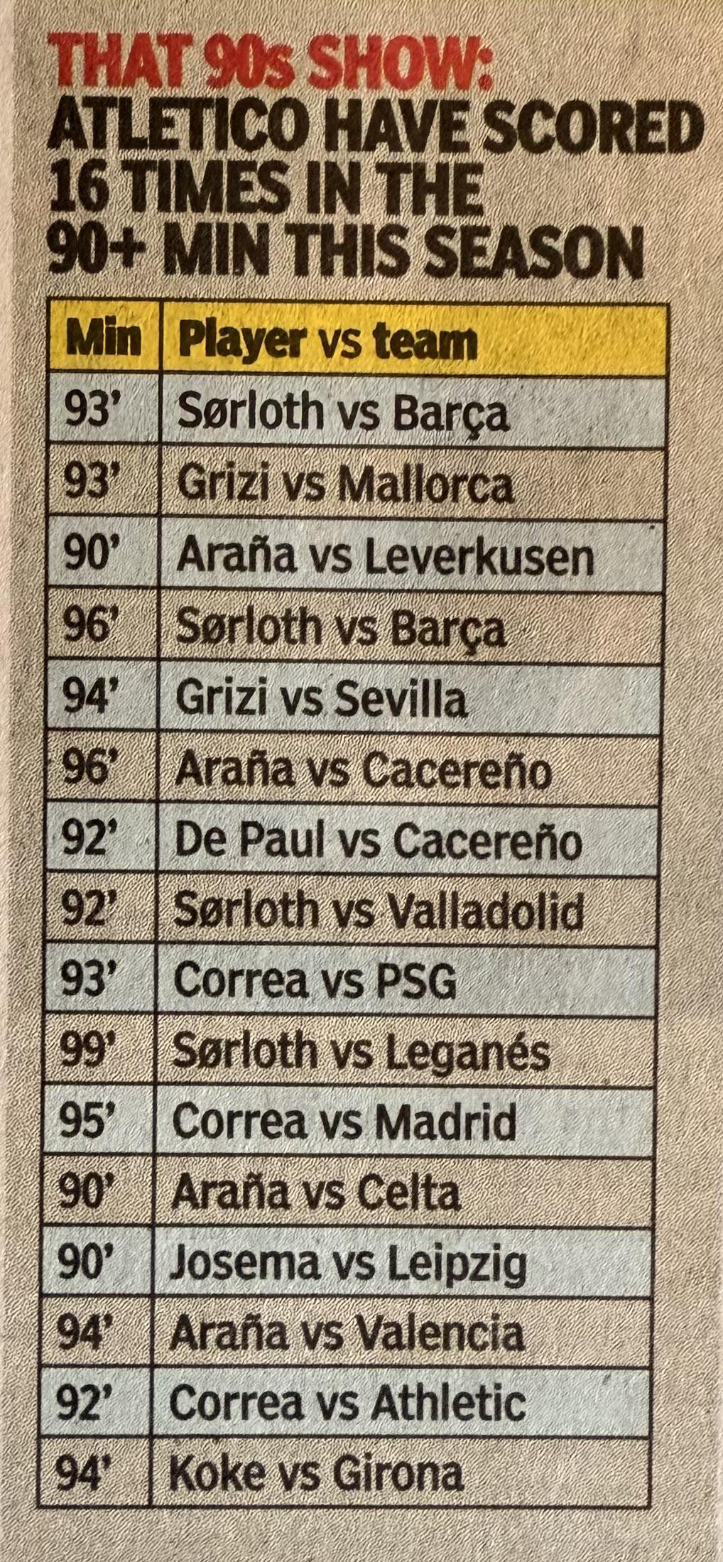 Naime, Atletiko Madrid je ove sezone čak 16 puta postizao golove u nadoknadi vremena i po tome im nema ravnih na Starom kontinentu.