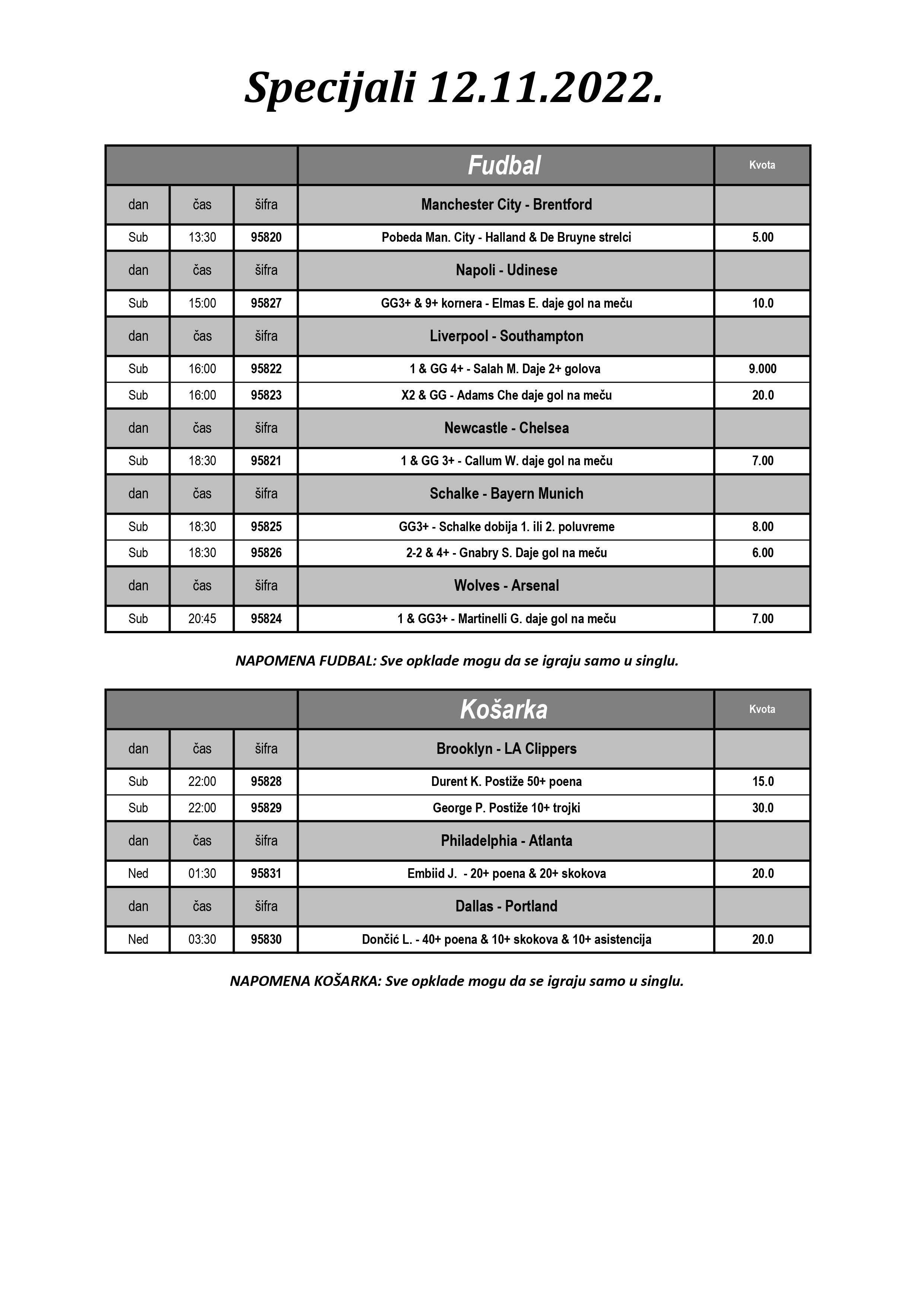 Što se tiče košarke, u centru pažnje je večernji meč, od 22 časa igraju Bruklin i Klipersi, obračun Duranta i Pola Džordža, ako KD postigne 50+ poena, kvota je 15.00, ako lider Klipsa, Džordž ubaci 10+ trojki, imate kvotu 30.