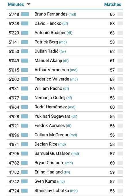 Bruno Fernandeš je jedan od njih i upravo on je igrač sa najviše minuta u svim takmičenjima. Zvuči neverovatno, ali on je odigrao do sada u ovoj godini 5748 minuta, 500 minuta više od bilo kod drugog u Evropi.