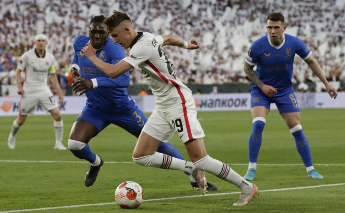 Posle prvih 45 minuta u finalu Lige Evrope golova nema, Ajntraht - Rendžers 0:0. Meč se igra pred krcatim tribinama stadiona "Ramon Sančez Pishuan" u Sevilji.