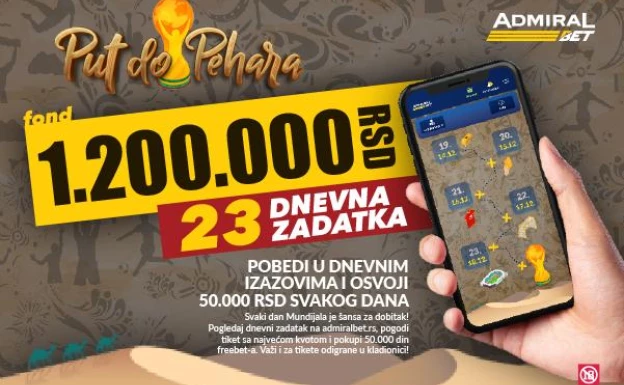 Ono što u ovom trenutku sigurno znamo jeste to da je AdmiralBet obuzela prava mundijalska euforija, gde vas čeka 23 dana dug “Put do pehara” i isto toliko zadataka, sa ukupnim nagradnim fondom od 1.200.000 dinara!