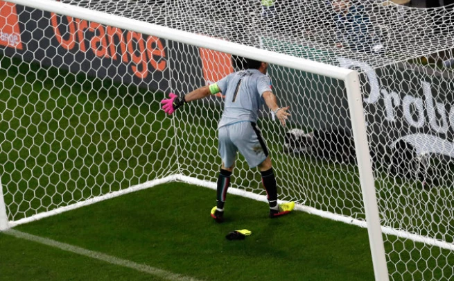Golman reprezentacije Italije pokušao je da se okači za prečku ali su mu ruke proklizale pa je završio na zemlji zbog čega su se pojedini saigrači uhvatili za glavu.