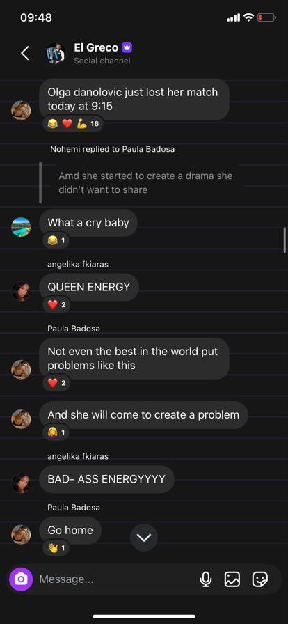 Naime, u Instagram grupi u kojoj Badosa komunicira sa članovima koji plaćau svoje članstvo, Španjolka je rekla da je Danilović odbila da se zagreva na istom terenu sa njom pre početka meča.