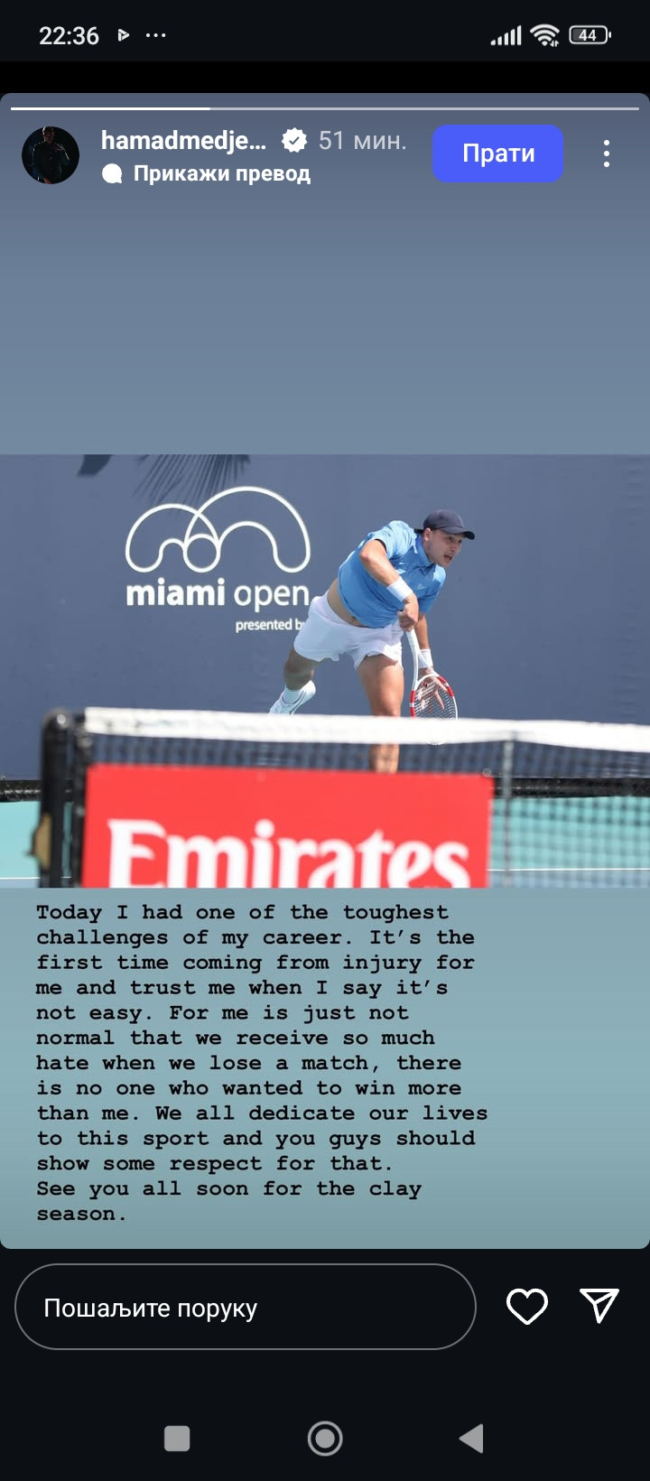 "Danas sam imao jedan od najtežih izazova u svojoj karijeri. Prvi put mi se dešava da se vraćam posle povrede i verujte mi kada kažem da to nije lako. Za mene jednostavno nije normalno da nas toliko mrze kada izgubimo meč, jer niko nije želeo pobedu više od mene. Svi mi posvećujemo svoje živote ovom sportu i trebalo bi da pokažete poštovanje prema tome. Vidimo se uskoro na šljaci!", rekao je Međedović, očigledno nezadovoljan komenatarima koje je dobio posle izgubljenog duela.