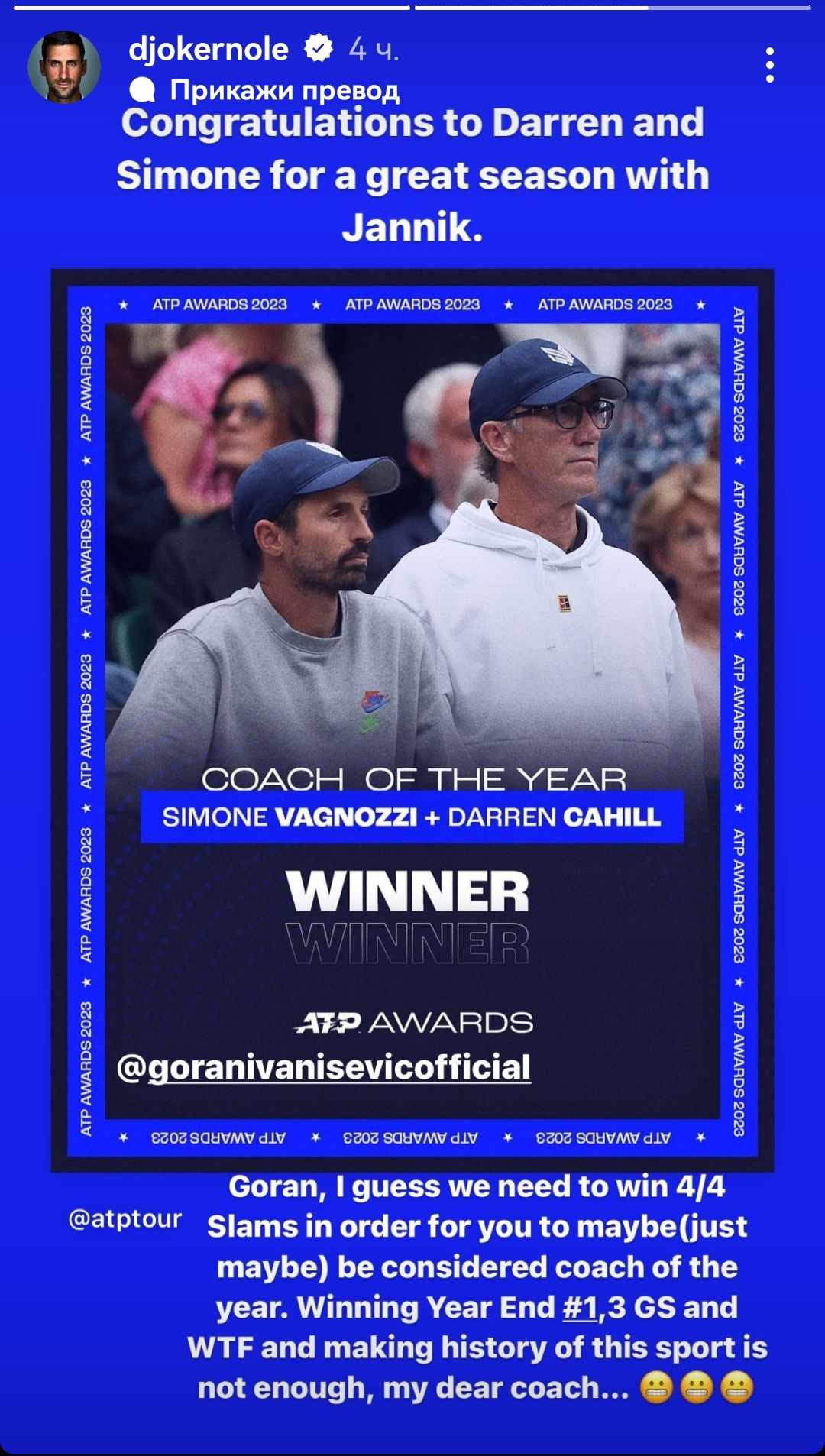 "Gorane, pretpostavljam da moramo da osvojimo četiri od četiri grend slema, da bismo možda ušli u uži izbor za nagradu. Završena godina na broju jedan, tri grend slema, Završni masters... Ispisivanje istorije nije dovoljno, moj dragi treneru", napisao je Srbin.