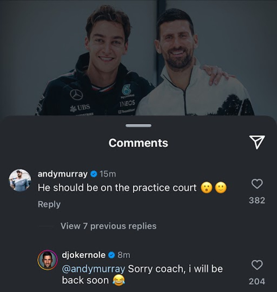 Mercedes je na svom Instagramu objavio fotografiju Đokovića i vozača Mercedesa Džordža Rasela, koju je komentarisao Britanac.