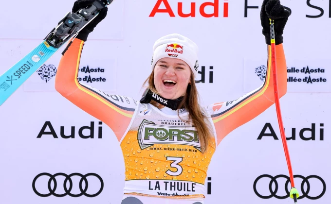 Nemačka skijašica Ema Ajher pobedila je danas u superveleslalomu, koji je u okviru Svetskog kupa vožen u italijanskom La Tuju.