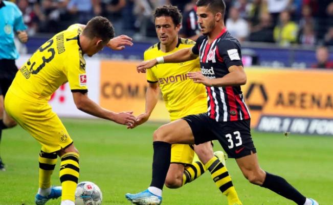 Posle par napada, tim iz Frankfurta dolazi do izjednačenja pred pauzu. Đibril Sov odlično nalazi Andre Silvu, Portugalac postiže svoj prvi gol u dresu Ajntrahta. 43. minut 1:1.