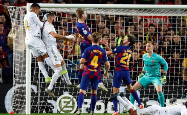 U devetom minutu smo videli lepu kombinaciju Iska i Benzema, Španac petom upošljava Francuza koji šutira pravo u Ter Štegena. Ubrzo na drugoj strani Alba prolazi po levoj strani, igrač Barselone apeluje na igranje rukom Karvahala, ali Hernandez i uz pomoć VAR konsultaciju nastavlja igru.